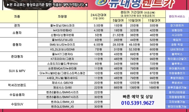 항상 이용해주시는 고마운 당신을 위한 고객만족 서비스^^2020년 2월 이후(코로나19 이후) 신차(새로 출시된 자동차)의 경우 모든 자동차를 금연차로 운영하고 있습니다.(@차량 내 흡연을 원하시는 분은 렌터카를 이용하실 수 없습니다.) 새 자동차의 경우 안전운전 시스템을 개선하여 보다 안전운전에 필요한 옵션이 기본 장착되어 있습니다.(간단히 설명하자면 전방, 측면, 후방의 자동차 주의 알림 시스템입니다.) 뉴대명렌터카의 작지만 소중한 안전에 대한 노력과 철학이 담겨 있습니다.(물론 모든 차량이 설치되어 있지는 않지만 2021년 하반기 출시된 자동차의 경우 모두 적용되는 옵션입니다.) 항상 안전과 건강을 유지하는 여러분과 우리가 될 수 있도록 더욱 정진하겠습니다.고마워요^^